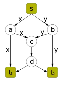 在右图的网络拓扑中,s节点试图向组播两条消息x,y。设每条消息占用的带宽为1,每个节点之间的网络带宽也为1,那么每个节点之间只能同时传输一条消息。线路cd上会需要同时传输x,y,这在一般的传输方案中是行不通的,所以需要网络编码在c处将x,y异或,合成一条消息然后发送。