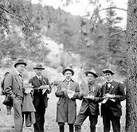 1915年在落基山国家公园开幕典礼上的合影。由左及右:马塞、亚德、特罗布里奇(落基山公园负责人)、考林(国家公园摄影师)、奥尔布赖特。