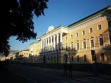 正门前是一对白色大理石美第奇狮子[1][5],因普希金的最后一首长诗《青铜骑士》而著称。