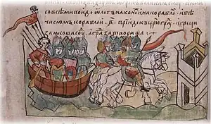 ![]() 中世纪罗斯绘画:奥列格率领一队马拉船围攻君士坦丁堡城墙。 | |||||||