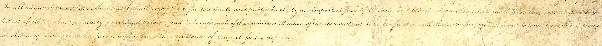 In all criminal prosecutions, the accused shall enjoy the right to a speedy and public trial, by an impartial jury of the State and district wherein the crime shall have been committed, which district shall have been previously ascertained by law, and to be informed of the nature and cause of the accusation; to be confronted with the witnesses against him; to have compulsory process for obtaining witnesses in his favor, and to have the Assistance of Counsel for his defence.[1]