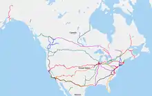 •  加拿大:有联通,使用相同的1,435毫米(4英尺8 12英寸)轨距(不包含经由阿拉斯加的线路)