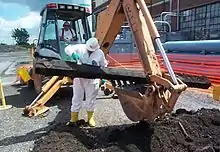 身穿防護服工兵對土壤進行測試。