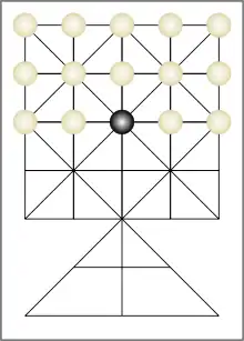 - 棋盤為五橫五豎的橫縱線交叉,另有東南-西北向、西南-東北向的斜線各三條,並在一側中點為三角形頂點,添上一個等腰三角形。三角形有一橫一豎交叉。全部共三十一個棋點。