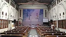 天主堂本體大致坐南朝北,位於高出街平面約三公尺的小丘上,前面的入口有一個廣場。入口廣場外則為後來改建的木製小驛站,而進了入口廣場,則有兩道如雙臂般的階梯自上面的平台環抱著廣場,而平台下與階梯間自然形成了一處壁龕,安置著一尊聖母像。天主堂的建築立面以洗石子牆、垂直分割列狀的彩色拼貼玻璃與十字架為主要元素,在挑高的鋼筋混泥土結構與雙斜面屋頂影響下塑造出高聳莊嚴的意象。聖壇背景是耶穌將地球託付給聖母照顧的浮雕,兩旁並有對聯。而在兩側的牆壁上,則裝飾以苦路十四處為主題的木雕,另外還有燭光燈飾與壁面彩色拼貼玻璃,共同營造出教堂的空間氛圍[2]。