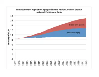 到2030年,嬰兒潮時期出生的人的退休人數,預計會把Medicare參加人數增加到8,000萬以上。此外,每個參加人員的相對工作人數將從3.7人降到2.4人,而美國的總體醫療衛生費用正在上漲,對Medicare造成巨大的財務挑戰。到2026年,醫療保險支出預計將從 2018年的7,400億美元增長到1.2兆美元,或者從佔GDP的3.7%增長到4.7%。[20]這批嬰兒潮時期出生的人預計壽命會更長,對未來的Medicare會增加更大的負擔。《2019年Medicare受託人報告》估計,到2043年(當最後一個嬰兒潮時期出生的人年滿80歲時),支出在GDP的佔比將增長到6%,然後成長趨緩,到2093年會佔GDP的6.5%。針對這個挑戰,國會在制定2010年的PPACA和《2015年醫療獲得及兒童醫療保險重新授權法案》(MACRA)時,大幅削減對醫療機構(主要是急性護理醫院和療養院)的支付,議員們還提出許多其他提案,希望能更進一步降低Medicare的成本。