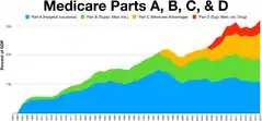 根據《2019年Medicare受託人報告》,Medicare在2018年覆蓋的美國人超過5,990萬,受益者之中有5,200萬人年齡在65歲以上,年輕人約有800萬。[1]根據受託人年度報告和Medicare付款諮詢委員會(MedPAC)的研究,Medicare負擔參保人的醫療衛生費用大約一半。參保人幾乎全是利用購買額外的私人保險,和/或加入Medicare C部分,或者D部分來覆蓋其餘費用的大部分。