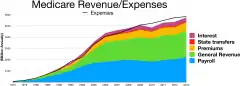 2018年,Medicare的支出超過7,400億美元,約占美國GDP的3.7%,佔美國聯邦總支出的15%以上。[20]由於這兩個信託基金有不同收入來源(一個是專用,一個則不是(從美國國庫一般收入撥款)),因此受託人將支出定為GDP的佔比,而不和聯邦預算比對。
