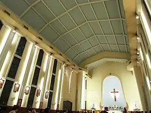 進入聖堂後,可看到聖堂內部沒有支柱,寛濶的空間,像是一個小型的天空。由縱橫線條裝飾的平頂,令人感覺像身在一架大蓬車內。聖堂最前方的正祭台,背後是一個圓拱,兩邊有吹著喇叭的漆金天使塑像。