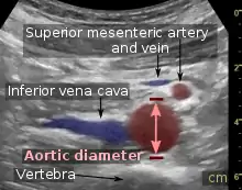當醫生懷疑腹部器官可能異常脹大時,也會進行腹部超聲波檢查。能發現的病症包括腹主動脈瘤、脾臟腫大、尿瀦留等。診斷為腹主動脈瘤的標準是:腹主動脈(以最外層計算)的直徑超過3厘米,即為腹主動脈瘤[6]。