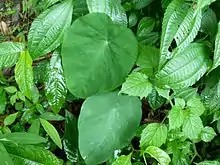 地下莖塊接近直立狀,長約10(3.9英寸)。葉片寬闊如卵形或卵心形、盾狀,葉片先端銳尖或略圓,基部呈心形,葉柄呈綠色。[2]