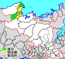 (紫色:現屬福知山市、紅色:現屬宮津市、橙色:現屬京丹後市、黄色:現屬伊根町、綠色:現屬與謝野町))