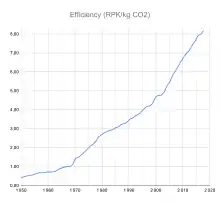 從1968年到2014年,新飛機的平均油耗下降45%,年複合率下降1.3%,每年的下降數字不一。 [33]到2018年,每收入噸公里 (RTK) 的二氧化碳排放量比1990年減少一半以上(為原來排放的47%)。[34]從2000年到2019年,航空業能源強度從21.2降為12.3兆焦耳/收入頓公里(MJ/RTK),減幅達到42%。[35]
