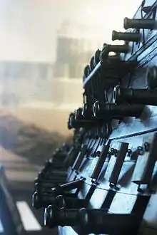 早在1501年,在船体上切割出炮口就已经是一种常见的做法。据传这一创新的发明者是一位名叫狄斯恰斯(Descharges)[lower-alpha 12]的布雷斯特造船工程师,但这很可能是对已经使用了几个世纪的商船船尾装货口逐步改造而来[14][13]。最初,炮眼被用来安装重型的所谓的船尾追击炮,但不久炮眼就被转移到了船身的两侧。这一变化使得历史上第一次有可能对船身一侧所有炮进行协调齐射,至少在理论上是如此[15]。从16世纪到蒸汽船问世的最初几十年,船体的每一侧都有一排排的火炮。在舰船的一侧开炮被称为“舷侧齐发”[lower-alpha 13]。