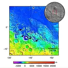 在火星上某些區域出現倒轉地形,也就是河床比周圍的區域高,而不是比周圍區域低的河谷狀態。地形倒轉的原因是大型岩石的沉積或膠結之後,河谷周圍的區域會被侵蝕,但河谷較能抵抗侵蝕並且型態較像突起的山脊。火星偵察軌道器的 HiRISE 拍攝的影像中顯示該區域內的古老河道是倒轉地形[2]。