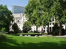 原来房屋的最后一栋於1921年拆除。花园以椴树为特色,由威廉·蒙塔格根据建筑师小乔治唐斯1815年的设计开发。[4] 1819年,[5] 伦敦学院搬进了威廉·布鲁克斯[6]在花园北端精心设计的优雅场所[7]。它于1912年关闭,这些建筑由伦敦大学使用,直到1936年拆除。从19世纪20年代开始,圆环的正面是巨大的一位论派教堂,在威廉·约翰逊·福克斯的领导下建造,後來成爲康威大厅伦理协会[8]。