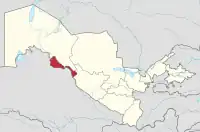 花拉子模州位於烏茲別克西部。它與以下州份或國家相連(從北開始逆時針):卡拉卡爾帕克斯坦自治共和國土庫曼布哈拉州。公路全長2,000公里,另外鐵路130公里。