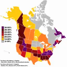 ![]() 英格蘭裔美國人与英格蘭裔加拿大人的各州/省人口占比。 | |