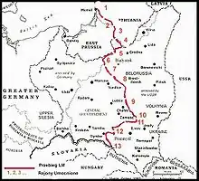 1939年9月17日,随着第二次世界大战的开始,苏联进入波兰东部的领土(现在的乌克兰和白俄罗斯西部地区)。 同年9月28日与希特勒的德国签署的《友好和边界条约》,将苏联的西部边界大致确定在科尔宗线上,但比亚里斯托克地区除外,那里的边界略微向西。 在吞并了西乌克兰和西白俄罗斯之后,斯大林防线不再是国防前线、失去了它的意义,国防前线防线向西移动了300公里,即所谓的莫洛托夫防线。 这一边界变化是苏联外长莫洛托夫签署的《里宾特洛甫条约》的直接后果,因此被称为莫洛托夫线。 这个名字是非正式的,相对来说是最近才开始使用的[1]。