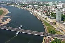 从上卡塞尔和赫尔德特之间的莱茵河左岸望去,莱茵之膝大桥与邻近的州议会大楼、莱茵塔和城市之门一起,构成了杜塞尔多夫的城市景观,尤其是内城南部的天际线。