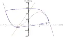 蓝线为菲茨休-南云模型在相空间中的轨迹,粉线为三次零斜率線,黄线为线性零斜率線。这里的刺激电流强度被设为0.5。