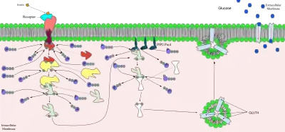 GLUT4的机制是级联效应的一个例子,其中配体与膜受体的结合会放大信号并引起细胞反应。在这种情况下,胰岛素以二聚体形式与胰岛素受体结合并激活受体的酪氨酸激酶结构域。然后受体募集胰岛素受体底物1(IRS1),它结合磷酸肌醇3-激酶。磷酸肌醇3-激酶将膜脂PIP2转化为PIP3。PIP3被蛋白激酶B和PDK1特别识别,PDK1可以磷酸化并激活PKB。磷酸化后,PKB处于活性形式并磷酸化TBC1D4,从而抑制与TBC1D4相关的三磷酸鸟苷酶激活结构域,从而使Rab蛋白从其二磷酸鸟苷变为三磷酸鸟苷结合状态。三磷酸鸟苷酶激活结构域的抑制使级联中的下一个蛋白质以其活性形式存在,并刺激GLUT4在质膜上表达。[24]