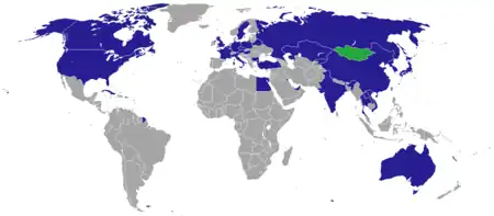 設有蒙古国大使館或領事館之國家分布图