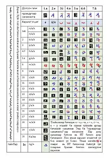 ᠭᠡᠢᠭᠦᠯᠦᠭᠴᠢegesigtü geigülügi(20个音调)。蒙古婆罗米文是一种拼写和音节[2]组合的,从上往下,从右向左竖写的文字[3] 。但是没有像回鹘式蒙古字母那样的同一字母在词首、词中和词末显示不同的符号形式,回鶻式蒙古文源于敘利亞字母。