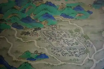 清康熙《京杭道里图》泰安府城局部,可见蒿里山与社首山之间的庙宇。