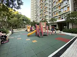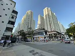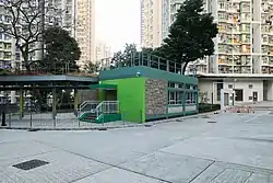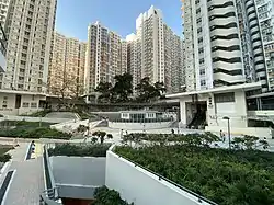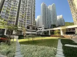 蘇屋邨二期重建後外貌,後方樓宇為百合樓(2018年6月)