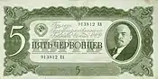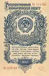1947年12月14日,苏联实行币制改革:废除了切尔文银行券;旧卢布现钞以10比1换成新卢布;对于个人存款,在3000旧卢布以下的按1比1兑换,3001-10000卢布的按3比2兑换,1万卢布以上部分按2比1兑换;集体农庄存款按5比4兑换;旧公债按3比1兑换;每月工资额度按1比1变为新卢布。目的是战时农民交售粮食获得了大量卢布存款被压制掉。1947年版卢布包括1、3、5、10、25、50、100共计7种面额,版面是苏联卢布历史上最大的。[4]其中1、3、5卢布是以国库券发行。