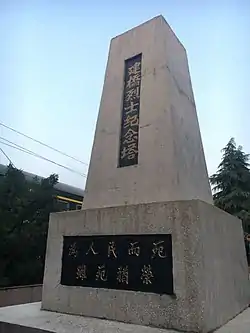 淮河大铁桥建桥烈士纪念塔位于桥南端西侧旁边,为纪念在修建便桥和抢修主桥时牺牲的解放军铁道兵战士,于1949年7月1日建成[3]。塔的底部为烈士纪念碑,该碑由碑基座、碑身构成。碑基座为砖混结构,外饰水磨石。碑文内容为铁道兵团第三支队抢修淮河铁桥的过程,以及抢修时牺牲的战士的名字[3][4][10]。
