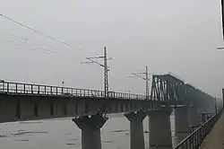 2002年,作为复线改造的一部分,一座紧挨着老桥、与老铁路桥相似的新桥被建成[13]。新的复线桥全长2100米,其主跨为多孔钢梁,采用浮托拖拉法一次架设就位,曾荣获多项科技奖项[14]。因此,两座桥也常被统一称为蚌埠淮河铁路双桥。