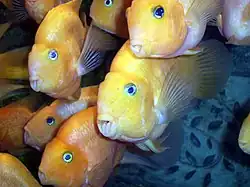 血鸚鵡鱼,又叫做紅財神、財神魚、鸚鵡魚,是橘色雙冠麗魚(Amphilophus citrinellus)和紫紅火口(Vieja melanura)的人工雜交魚,而不是一個自然的物種。產於臺灣。