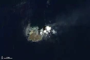 ![]() NASA於2014年7月拍攝的衛星空照圖,島嶼持續擴大,火山活動產生的熔岩已開始覆蓋舊島嶼區域。 |