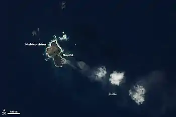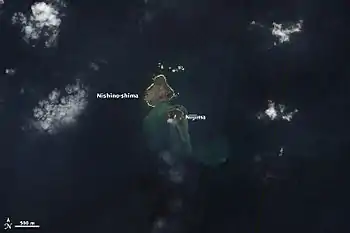 ![]() NASA於2013年12月初拍攝的衛星空照圖,上方較大島嶼為原本的西之島,右下角為新產生的島嶼。 |