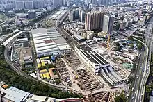 左侧及左上建筑为西塱车辆段;右下建筑为西塱站,其中地上建筑为1号线站房,站房左侧为22号线工地,右下侧为临时的A、B口,右侧为10号线工地,右上侧为广佛线临时换乘通道(原J口)。