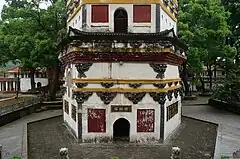 千佛塔又称砖浮屠,为唐玄宗敕建,明崇祯四年(1631)重修[1],2005年-2006年采用深层沉井排土纠倾法进行纠倾维修,并修复塔坪、塔心室楼板与楼梯等[2][3]。今塔为六角七层的楼阁式砖塔,高约46米,各层南北相对辟门,其余各面辟佛龛,南面每层门上皆有题额,自下而上分别为千佛塔、羽室才、金刚幢、灵就来、无上法、聪雨花和无明藏[4]。
