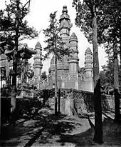 - 经幢:主塔四角的4座经幢式塔,其造型、装饰相同,均为八角密檐塔,高7米,各分五层,每层供有八座佛像。塔身分别阴刻有汉文经咒,其中西南小塔刻《千手千眼无碍大悲心大哈达喇呢神章妙名》、西北小塔刻《佛说药师如来本愿经》、东北小塔刻《金刚般若波罗密经》、东南小塔刻《楞严大哈达喇呢咒》。[1][15]