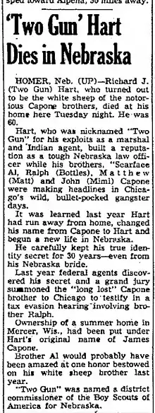 戰後,卡彭合法地改名為理查·詹姆斯·哈特(Richard James Hart),部分是為了紀念他最喜歡的牛仔電影明星威廉·S·哈特。他於1919年結婚,很快便成為一名聯邦禁酒探員,在內布拉斯加州的荷馬成家立室。經過一連串成功針對私酒販的襲擊後,他獲得了「雙槍」哈特的綽號。