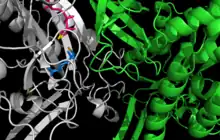 | Active site between two monomers of glutamine synthetase from Salmonella typhimurium. Cation binding sites are yellow and orange; ADP is pink; phosphinothricin is blue.[1] | |||||||