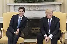 特鲁多支持的拱心石輸油管道被美国总统奥巴马拒绝,但与其保持良好的关系[63][64]。特鲁多与美国总统唐纳德·特朗普和墨西哥总统恩里克·佩尼亚·涅托在2018年签署北美贸易协定CUSMA。 特鲁多的第一个外交政策挑战包括贯彻他的竞选承诺,即从叙利亚内战中撤出加拿大空中援助并欢迎25,000名叙利亚战争难民。当唐纳德·特朗普成为总统时,加美关系恶化。特朗普政府迫使北美自由贸易协定重新谈判,以创建CUSMA,加拿大在允许增加美国牛奶进口方面取得了重大让步,削弱了加拿大的乳制品供应管理系统[65][66]。唐纳德·特朗普还对加拿大钢铁和铝征收关税,特鲁多对此进行了报复,对美国钢铁、铝和其他各种美国产品征收关税[67]。