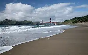贝克海滩是旧金山要塞的一部分,曾经是西班牙建立在旧金山的一个军事基地。1904年安装了地阱炮(disappearing gun),直至今日依旧矗立在该处。[1]当要塞不再是美军基地后,成为金门休闲区的一部分,由美国国家公园管理局管理。