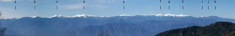 上述的南阿爾卑斯,可再細分三座山脈,包含了仙丈岳至三峰岳、鹽見岳、荒川岳、赤石岳、聖岳的狹義「赤石山脈」,以及白峰山脈與甲斐駒山脈[5]。