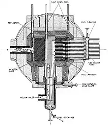 缸體直徑為70英寸(1.78米),內徑23英寸(0.58米),高39英寸(0.99米)。堆芯有312個燃料通道。這些通道以15度的間隔均勻地分布在堆芯周圍,分爲13層,每層有24個通道。每個通道最多可容納四個燃料元件。[4]更換燃料時,只需要把堆芯旋轉到含有被更換元件的通道,推入一個新的元件。用過的乏燃料元件會被推出堆芯,通過乏燃料通道跌落到反應堆底部等待收集。在滿功率下,該反應堆每天更換一到六個燃料元件。其頻率取決于燃料元件的濃縮度和孔隙度。這個設計能産生3兆瓦的熱能。