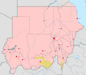 ![]() 2016年6月6日蘇丹的軍事局勢。 (最左邊的達爾富爾) 在蘇丹政府和盟友的控制下