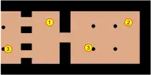 迈加隆组成示意图. 1: 门廊, 2: 正厅 (主要空间), 3: 立柱