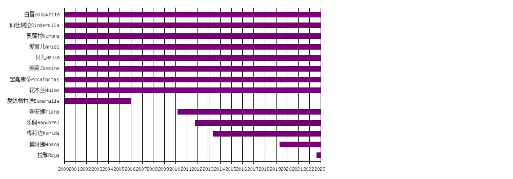 | 編號 | 公主 | 年龄 | 出道作品 | 上映年份 | 國籍 | 配偶/迪士尼王子 | 王室身份 | 加冕日期 |