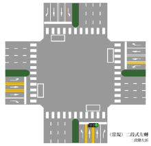 逆二段式待轉是在直行紅燈時,騎在行人穿越道上或牽車至同側的對向路口等待紅燈,綠燈時再騎在行人穿越道上或牽車並左轉,可以節省一次待轉格等紅燈的時間[1][2][3]。