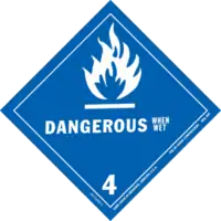 在危險品標貼規定中,藍底白字菱形或藍底黑字菱形用以標示與水生成易燃氣體的固體化學品[6]。